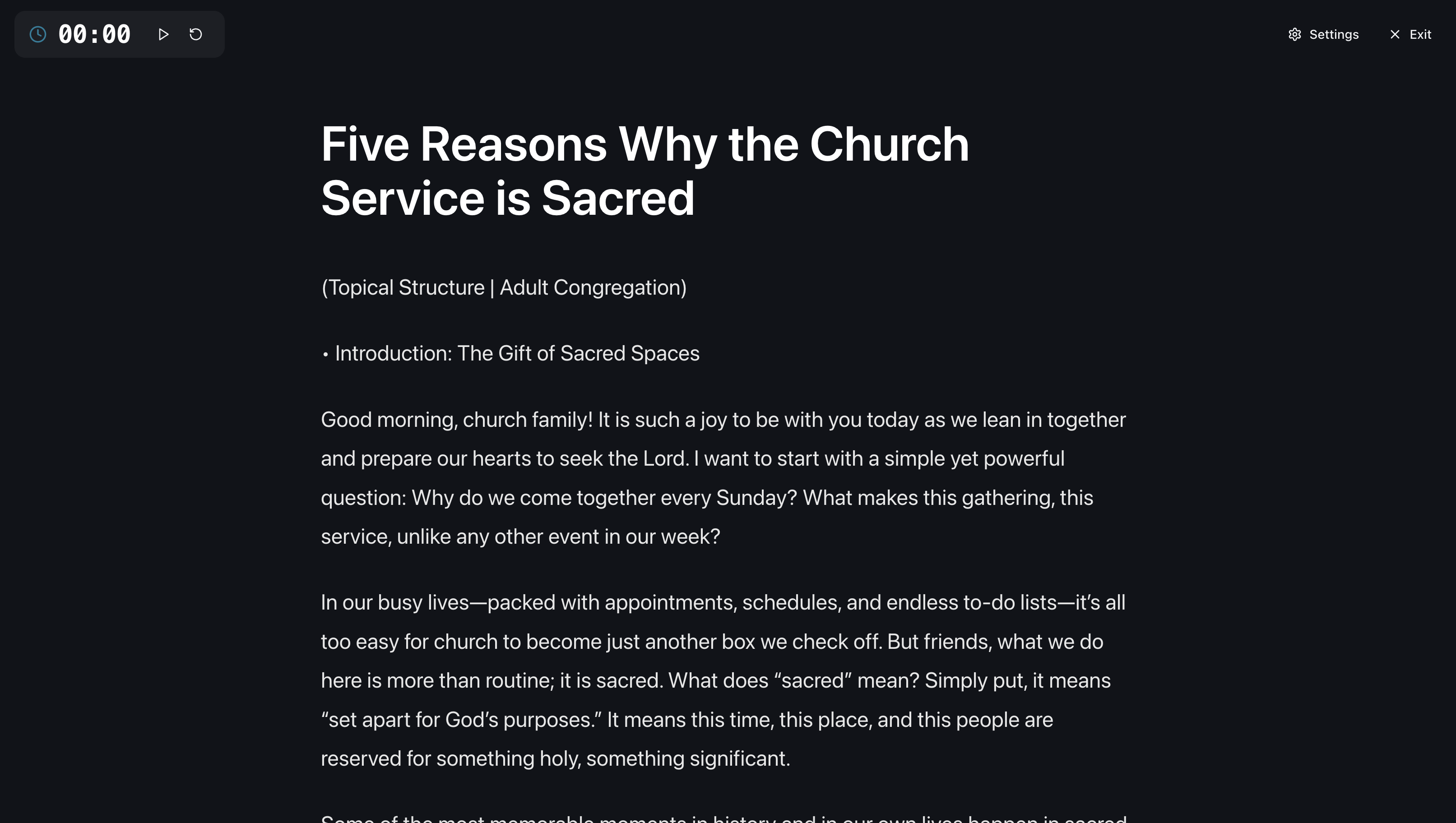 A distraction-free, large-text view designed for preaching. Built-in timer, easy scrolling, and settings to customize exactly how your sermon appears. No more squinting at tiny notes.